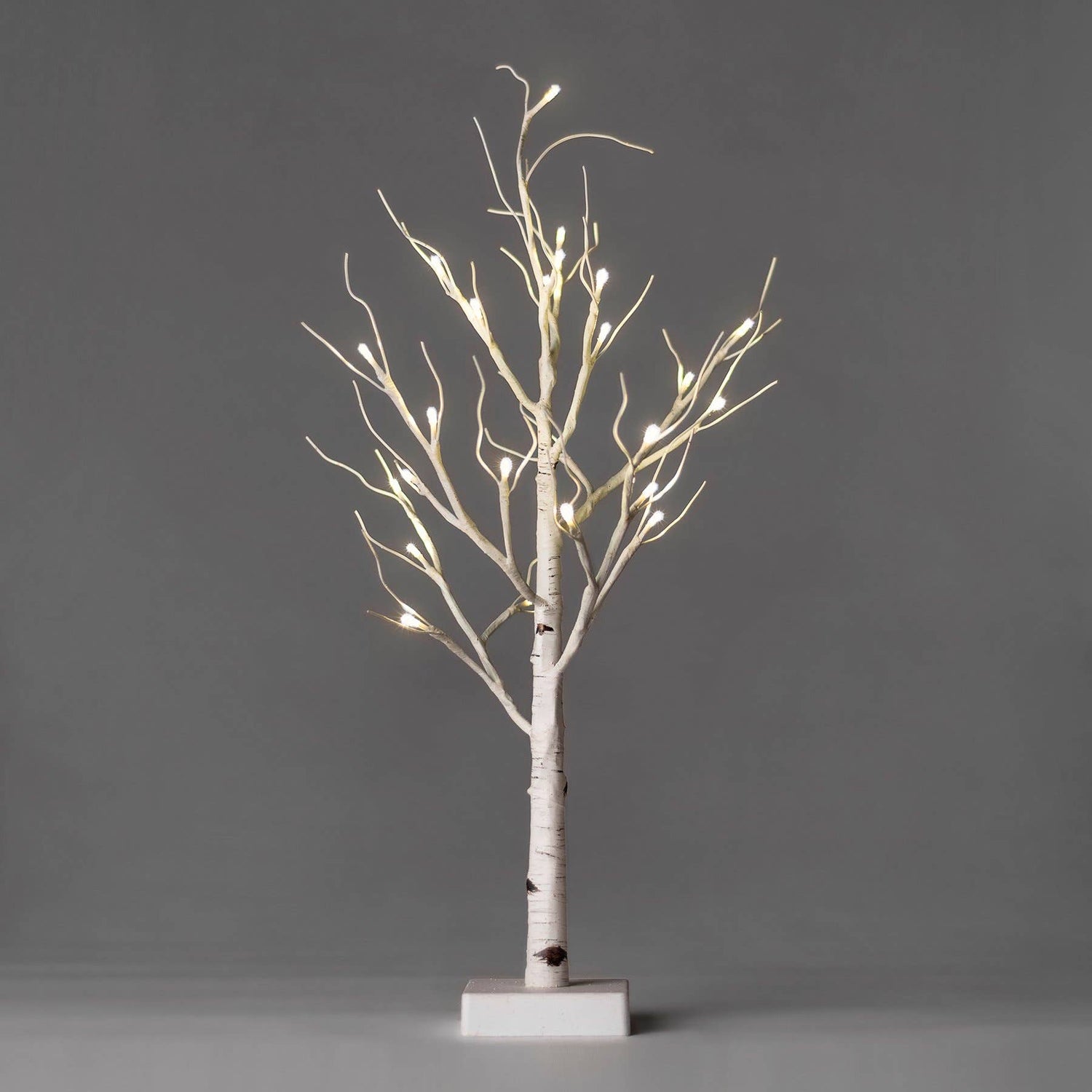 A stand-up lit birch twig decoration that stands 24" tall, contains 24 lights, 6-hour timer, and takes 3 AA batteries (not included).