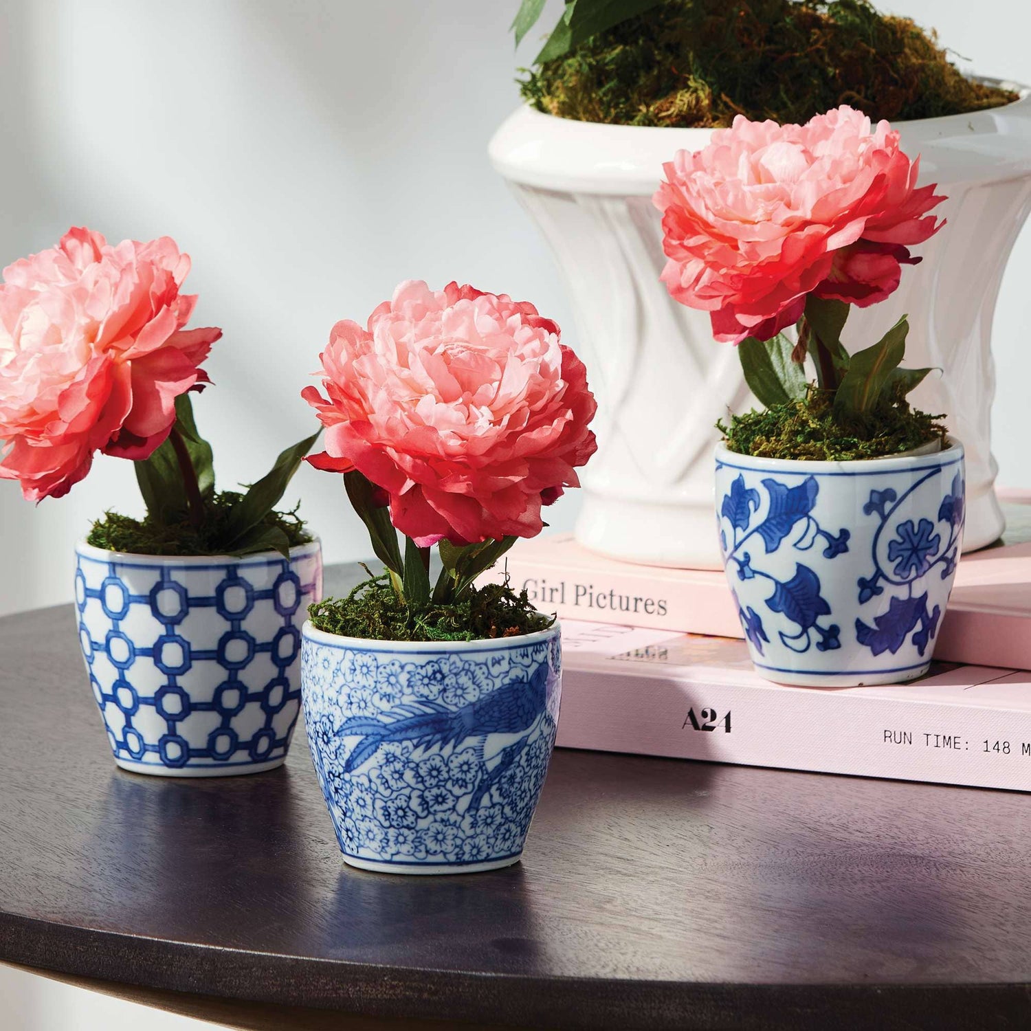 Enhance your curated collection with the Barclay Butera Mini Flower Pots, a group of six exquisite blue and white ceramic pots that embody timeless elegance. Each pot features a classic chinoiserie-inspired link pattern in sophisticated taupe and white, making them a versatile addition to any design palette. Handcrafted by skilled artisans using a centuries-old two-part method, these pots are not only unique but also showcase the beauty of high-fired porcelain. With an opening size of 2.75 inches, they are perfect for showcasing your favorite small blooms or succulents, adding a touch of nature to any interior space.