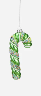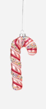 This elegant glass candy cane ornament features delicate sparkles and festive sprinkles, adding a refined touch to your holiday décor.