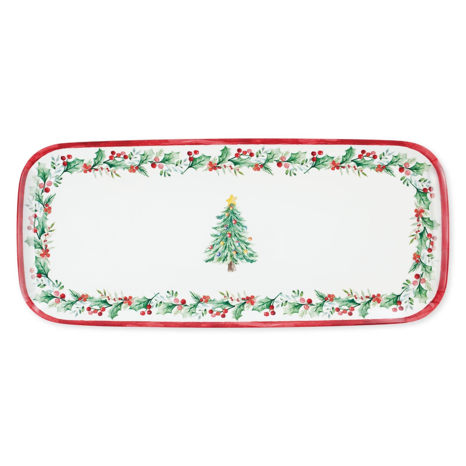 This 15" melamine serving tray features a festive Christmas tree design bordered with holly leaves and berries. Its virtually unbreakable construction makes it ideal for serving cheese, nuts, cold cuts, or Santa's cookies on Christmas Eve. Durable and easy to clean, it combines holiday charm with practical functionality for your seasonal gatherings.