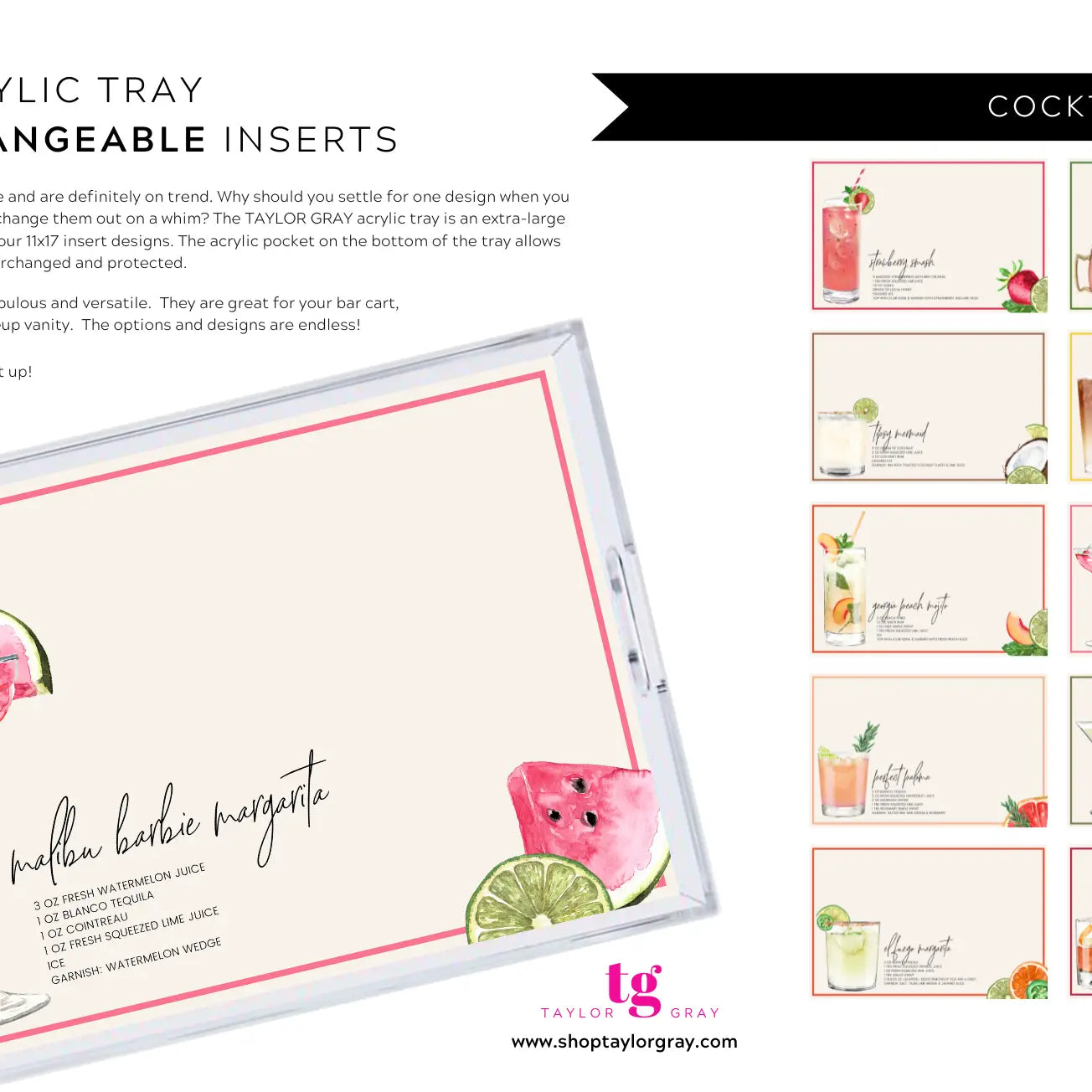 Cocktails for everyone! We are in love with these hand-drawn watercolor cocktail inserts. The detail is incredible, and the addition of the recipes is perfect for any bar cart. Featuring Spring & Summer cocktail recipes along with garnishes. Acrylic trays are all the rage and are definitely on trend. Why should customers settle for one design when they can have TEN designs and change them out on a whim? The TAYLOR GRAY acrylic tray is an extra-large 11x17 tray that perfectly fit our 11x17 insert designs. The patent pending pocket on the bottom of the tray allows the inserts to be easily interchanged and protected. The trays are functional, fabulous and extra-large. They are great for your bar cart, ottoman or even for makeup on your vanity. The options and designs are endless! ***LISTING IS FOR PAPER INSERTS & NOT ACRYLIC TRAY. TRAY SOLD SEPARATE.
