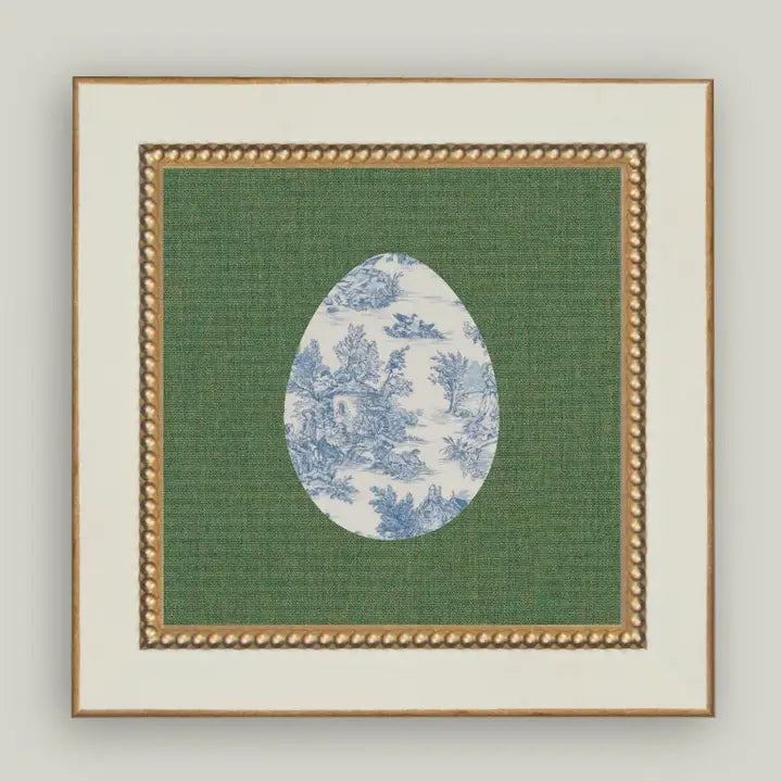 Bring timeless elegance to your décor with this charming countryside egg featuring a classic blue toile pattern. Housed in a 5x5 format, it's framed with a cream beaded brass frame that exudes vintage sophistication. The green matting provides a contrasting backdrop that allows the delicate toile design to shine. Perfect for collectors and those who appreciate traditional aesthetics, this piece adds a touch of pastoral charm and understated luxury to any room.