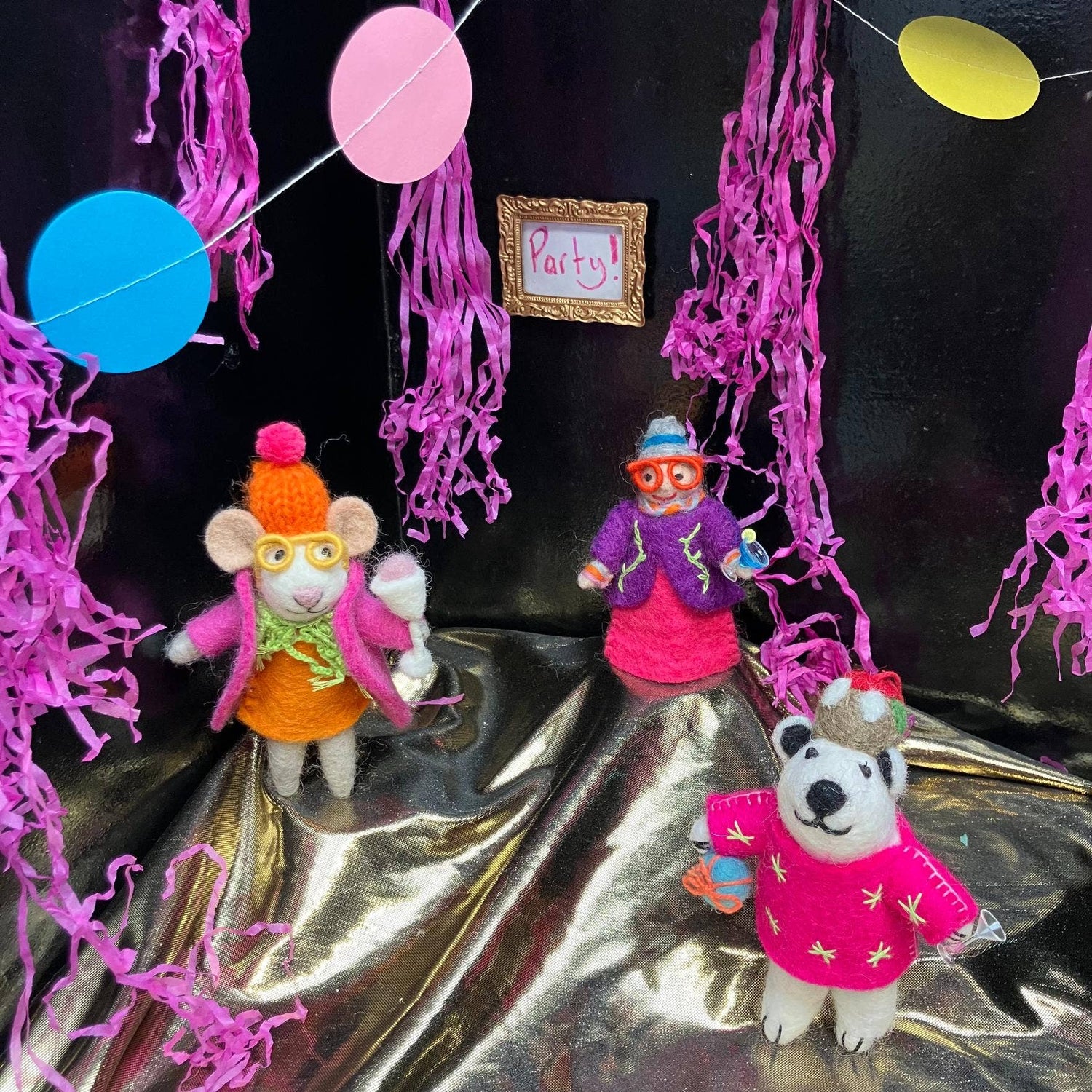 Introducing Margie the Merry Mouse, the sassiest rodent this side of the North Pole! This needle-felted diva is not your average mouse—she's here to "sleigh" the holiday scene!! Serving style that is hotter than chestnuts roasting on an open fire. Her sassy outfit consists of bright yellow wool wrapped wire glasses, a hand knitted orange and pink bobble hat. She's got a martini glass stitched into her paws, reminiscent of your favourite Auntie at the family Christmas soirée!!