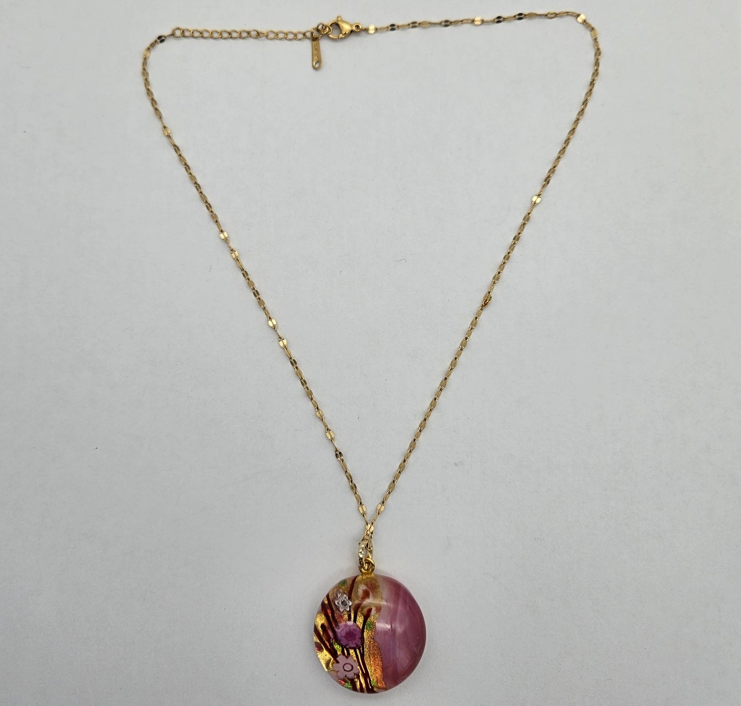 Beautiful Positano Murano glass infused with gold foil round pendant with cherry blossom design. Created by master artisans in Italy.